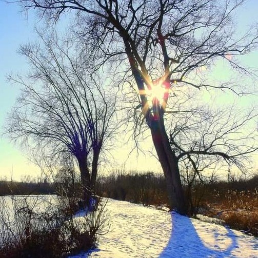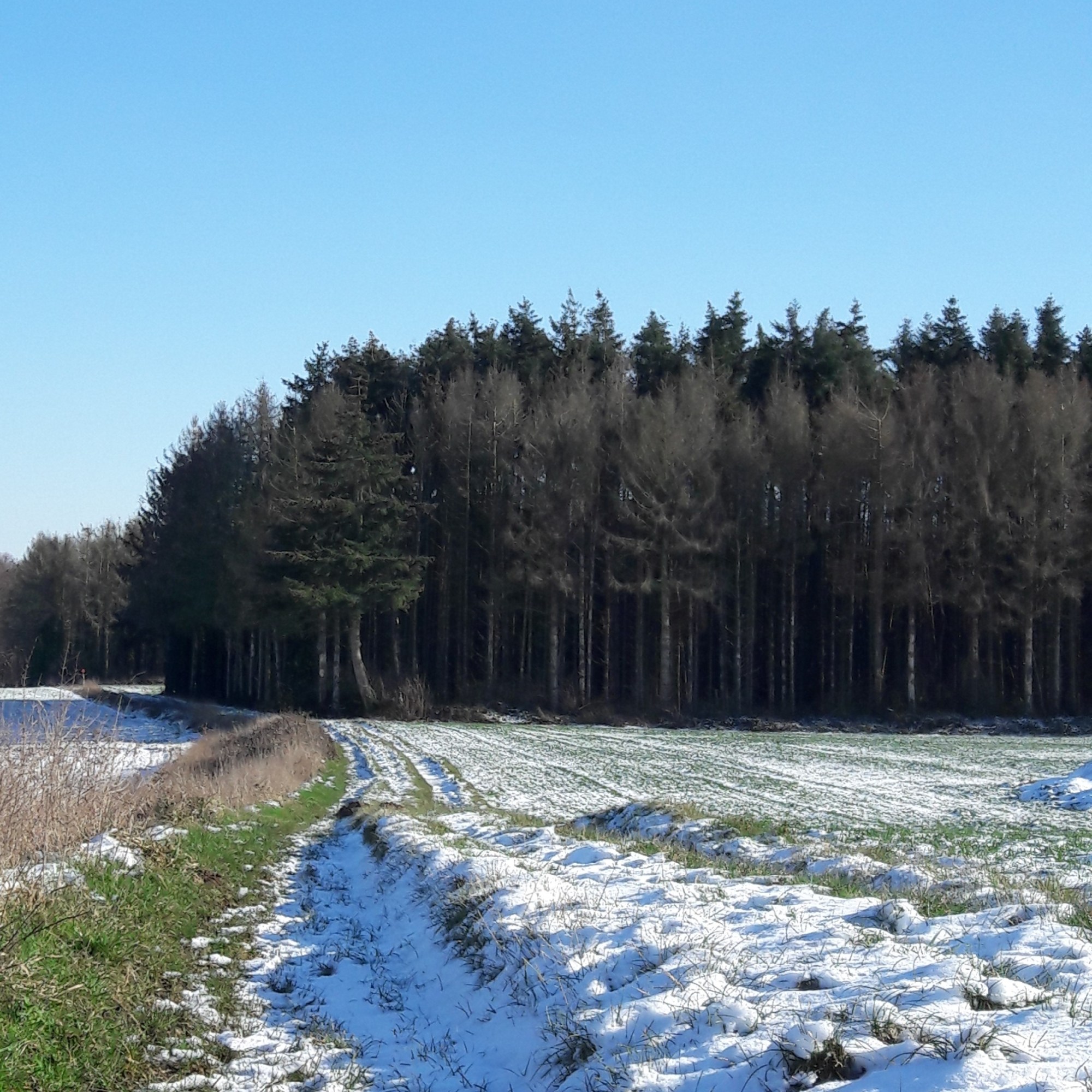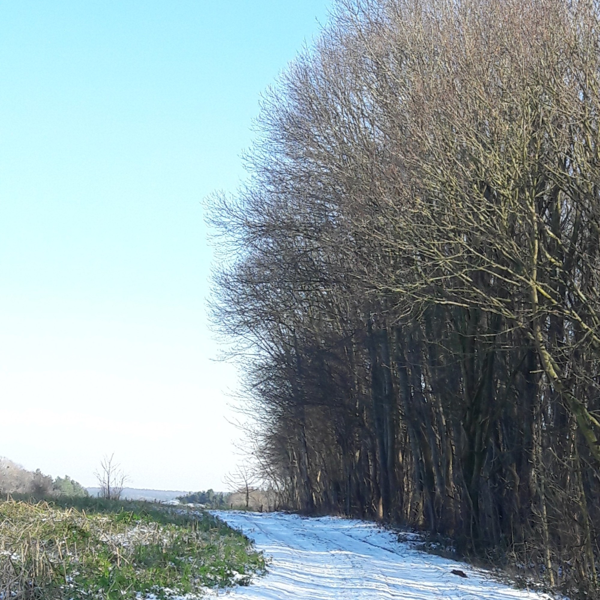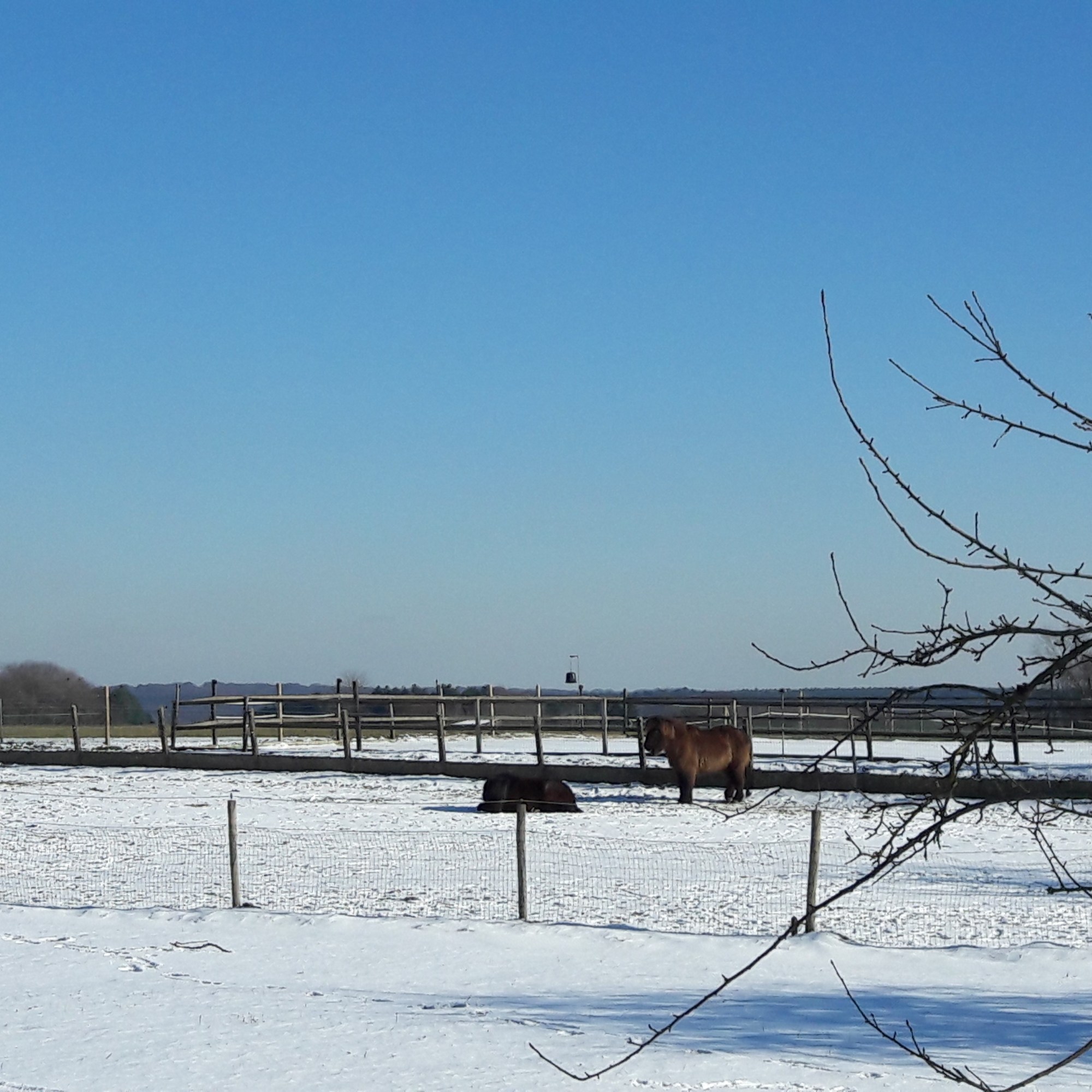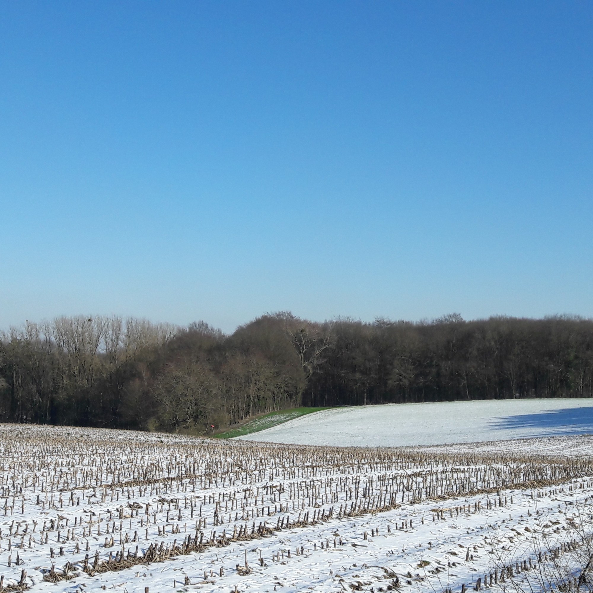 De dag straalt en wenkt naar buiten. Ik geef de kippen lopend water en de restjes van ons middagmaal. De -14° van vanochtend is ondertussen een -5°. Nu de zon ongehinderd kan schijnen, zal ze het kwik nog wel een zetje geven, hoop ik, en ik trek, (goed)gemutst, behandschoend en gelaarsd, het plateau op, de open vlakte tegemoet. Een venijnige wind uit het noordoosten tempert het wandelplezier. Hij blaast met horten en stoten wild om zich heen en prikt zich vast op mijn voorhoofd.