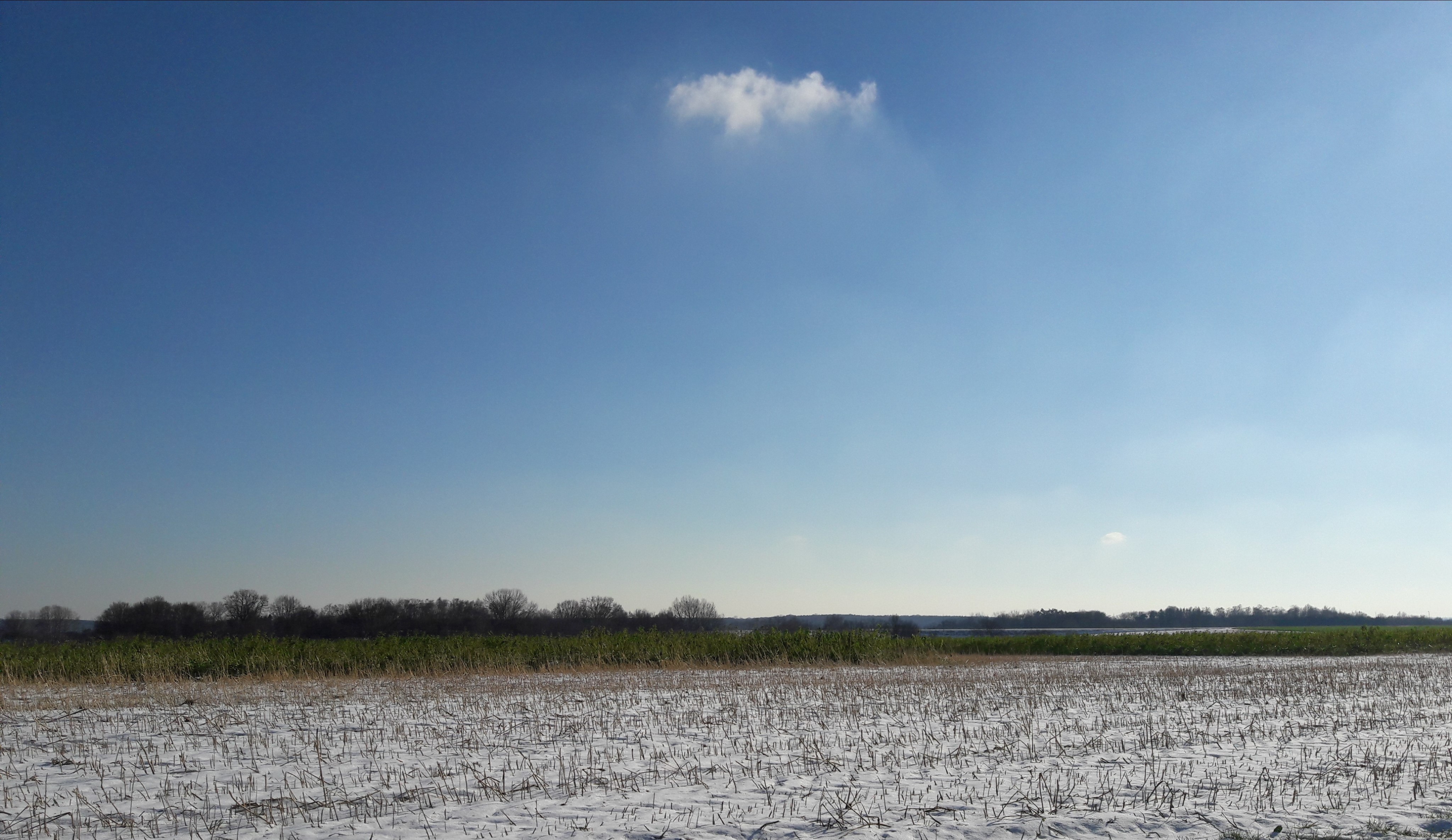 Voor me, een tiental kilometer verderop, ligt Leuven en rechts lonken de toppen van het Meerdaalwoud. Op dit plateau, net als op dat van Duisburg aan de overkant van het Ijsedal, is het adembenemend stil. Hier en daar fluit een vogel met lentekriebels en verder hoor je alleen het knerpen van sneeuw en ijs op de veldwegjes. Ik schiet wat plaatjes, hou het, met die ijzige wind schuin op kop, na een kwartier voor bekeken en keer op mijn stappen terug. Met de wind langs achter en de zon op kop is het terugwandelen een pak aangenamer. Ik adem diep, schep lucht, drink het blauw en hoor hoe Jimmy Cliff mijn hoofd binnendringt. “I can see clearly now. … bright bright sunshiny day.” Net voor ik weer het dal in duik, zie ik dit ene wolkje boven de gepoederde velden hangen.